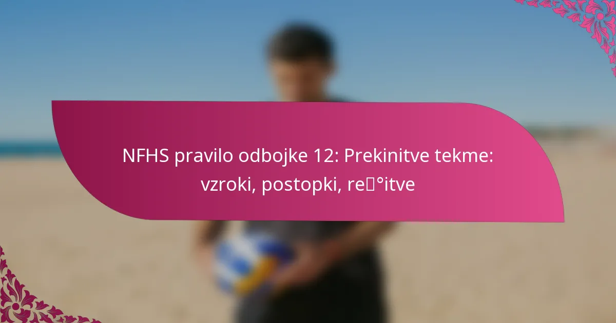 Prekinitve tekem v NFHS odbojki lahko nastanejo iz različnih razlogov, kot so poškodbe igralcev, težave z opremo ali zunanje motnje. Ključno je, da ekipe in uradniki razumejo postopke za obvladovanje teh prekinitvenih situacij, da zagotovijo varnost igralcev in ohranijo integriteto igre. Pravila NFHS zagotavljajo jasne smernice za reševanje prekinitvenih situacij, ki opisujejo potrebne korake za nadaljevanje igre in morebitne kazni.