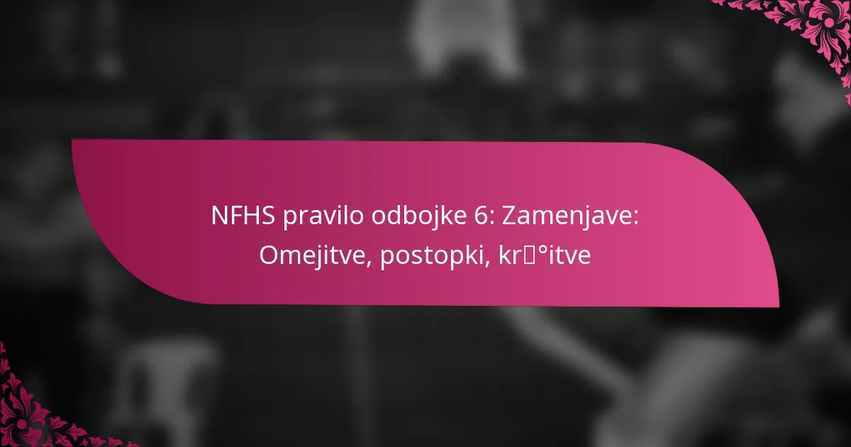 V NFHS odbojki lahko ekipe opravijo največ 18 zamenjav na set, zato je ključno razumeti pravila, ki urejajo ta postopek, za učinkovito strategijo ekipe. Zamenjave morajo slediti določenim postopkom, vključno s pravilnim signaliziranjem in časom, da se zagotovi skladnost in preprečijo kršitve, ki bi lahko motile igro. Poznavanje teh predpisov pomaga ekipam učinkovito upravljati rotacije igralcev in ohranjati tok tekme.